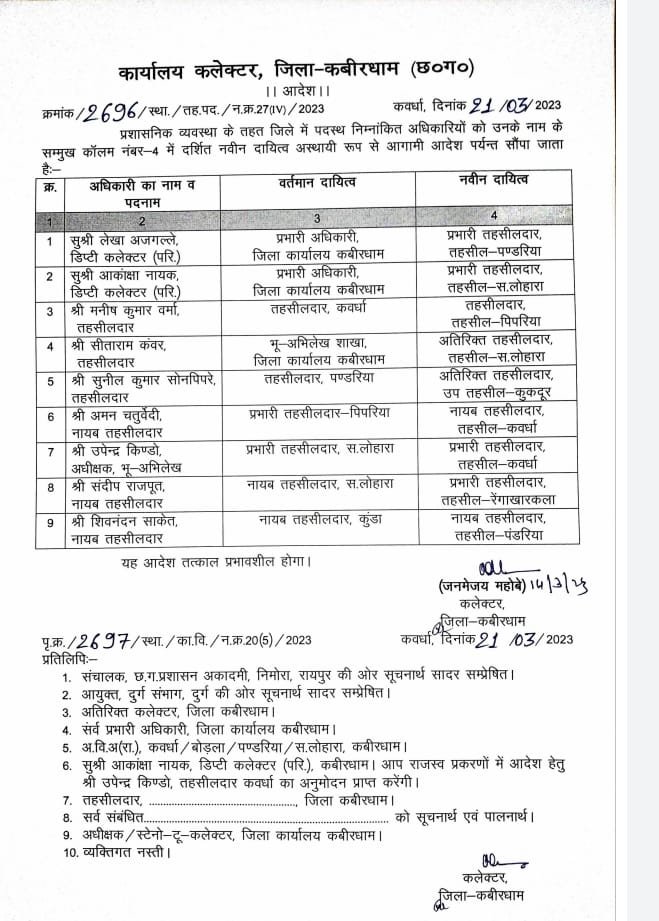 कवर्धा जिला कलेक्टर जनमेजय महोबे के द्वारा प्रशासनिक व्यवस्था के तहत निम्नांकित अधिकारी का नवीन पदस्थापना जिला के अंतर्गत तबादला किया गया है जिससे प्रशासनिक व्यवस्था में कसावट लाने के दृष्टिकोण से किया गया जिसका सीधा फायदा आमजन को अपने राजस्व संबंधी कार्य कराने मे फ़ायदा मिलेगा