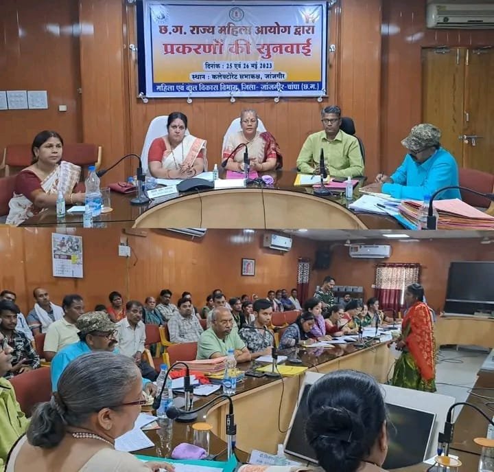 जांजगीर-चांपा 25 मई 2023/ छत्तीसगढ़ राज्य महिला आयोग की अध्यक्ष डॉ. किरणमयी नायक एवं सदस्य श्रीमती अर्चना उपाध्याय ने आज कलेक्टोरेट कार्यालय के सभाकक्ष में महिला उत्पीड़न से संबंधित प्रस्तुत प्रकरणोें पर जनसुनवाई की। छत्तीसगढ़ महिला आयोग की अध्यक्ष डॉ. किरणमयी नायक की अध्यक्षता में आज प्रदेश स्तर की 176 वीं और जिले स्तर की 6वीं जन सुनवाई हुई। जांजगीर-चांपा जिले में आयोजित आज की जनसुनवाई में कुल 40 प्रकरणों पर सुनवाई की गई। आज आयोजित जन सुनवाई में महिला आयोग की अध्यक्ष डॉ किरणमयी नायक ने महिलाओं से अपील करते हुए कहा कि महिलाएं ढोंगी साधुओं के प्रभाव में आकर अपना घर और भविष्य बर्बाद न करें। छत्तीसगढ़ राज्य महिला आयोग की अध्यक्ष एवं सदस्य द्वारा 26 मई को भी 40 प्रकरणों की सुनवाई की जाएगी।