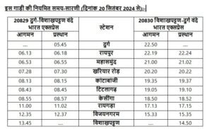 दुर्ग-विशाखापत्तनम वंदे भारत एक्सप्रेस के टाइम टेबल की बात करें तो ट्रेन दुर्ग स्टेशन से सुबह 5.45 मिनट पर दुर्ग से रवाना होगा. वहीं विशाखापत्तनम से ये ट्रेन दोपहर 2.50 बजे पर दुर्ग के लिए निकलेगी