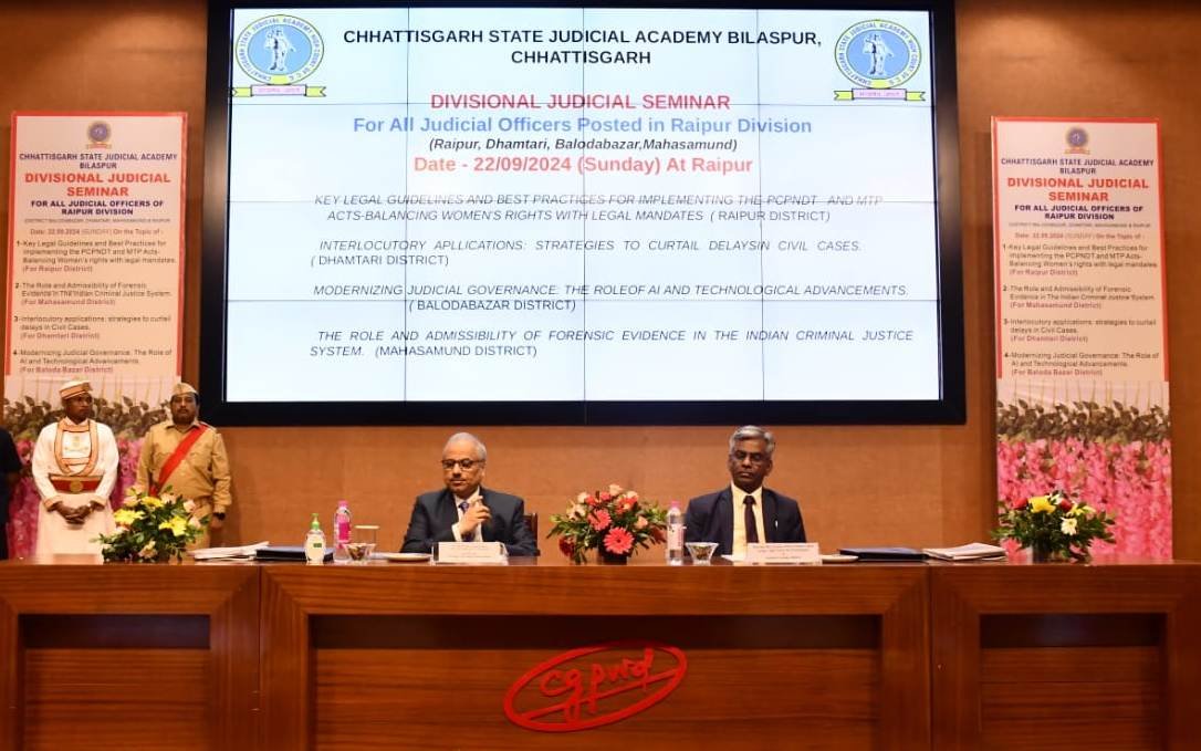 इस संभागीय सेमीनार में छत्तीसगढ उच्च न्यायालय के माननीय श्री न्यायमूर्ति पार्थ प्रतीम साहू द्वारा संबोधित किया गया । डिवीजनल सेमीनार में स्वागत भाषण प्रधान जिला न्यायाधीश रायपुर श्री अब्दुल जाहिद कुरैशी के द्वारा और परिचयात्मक उद्बोधन श्री सिराजुद्दीन कुरैशी डायरेक्टर छत्तीसगढ ज्यूडिशियल एकेडमी के द्वारा दिया गया। इस डिवीजनल सेमीनार में रायपुर, धमतरी, बलौदाबाजार एवं महासमुंद जिले के कुल 111 न्यायाधीशगण प्रतिभागी के रूप में सम्मिलित हुए। इस सेमीनार में पीसीपीएनडीटी अधिनियम, गर्भ का चिकित्सकीय समापन अधिनियम, सिविल ला, फारेंसिक साईंस, आर्टिफीशियल इंटेलिजेंस आदि विषयों पर प्रतिभागियों द्वारा प्रस्तुति दी गई।
