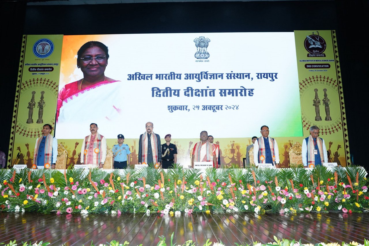 रायपुर :- राष्ट्रपति श्रीमती द्रोपदी मुर्मु ने आज एम्स रायपुर के द्वितीय दीक्षांत समारोह में संस्थान के 10 विद्यार्थियों को स्वर्ण पदक एवं पदोपाधि तथा 514 विद्यार्थियों को उपाधि प्रदान किया। इस अवसर पर उन्होंने कहा कि मेडिकल प्रोफेशनल का कार्य अत्यंत जिम्मेदारी भरा होता है, उनके निर्णय जीवन रक्षा से जुड़े होते हैं। उन्होंने उम्मीद जताई कि यहां से उत्तीर्ण चिकित्सक एवं पैरा मेडिकल छात्र इस जिम्मेदारी और उत्तरदायित्व का निर्वहन पूरी तन्मयता और क्षमता के साथ करेंगे। उन्होंने उपाधि एवं पदोपाधि प्राप्त करने वाले विद्यार्थियों को बधाई देेते हुए उनके स्वर्णिम भविष्य की कामना की। इस अवसर पर राज्यपाल श्री रमेन डेका, मुख्यमंत्री श्री विष्णुदेव साय, स्वास्थ्य मंत्री श्री श्याम बिहारी जायसवाल, एम्स रायपुर के अध्यक्ष प्रो. जॉर्ज ए डिसूजा, एम्स के कार्यपालक निदेशक एवं सीईओ लेफ्टिनेंट जनरल अशोक कुमार जिंदल सहित एम्स रायपुर के चिकित्सक एवं विद्यार्थी उपस्थित थे।