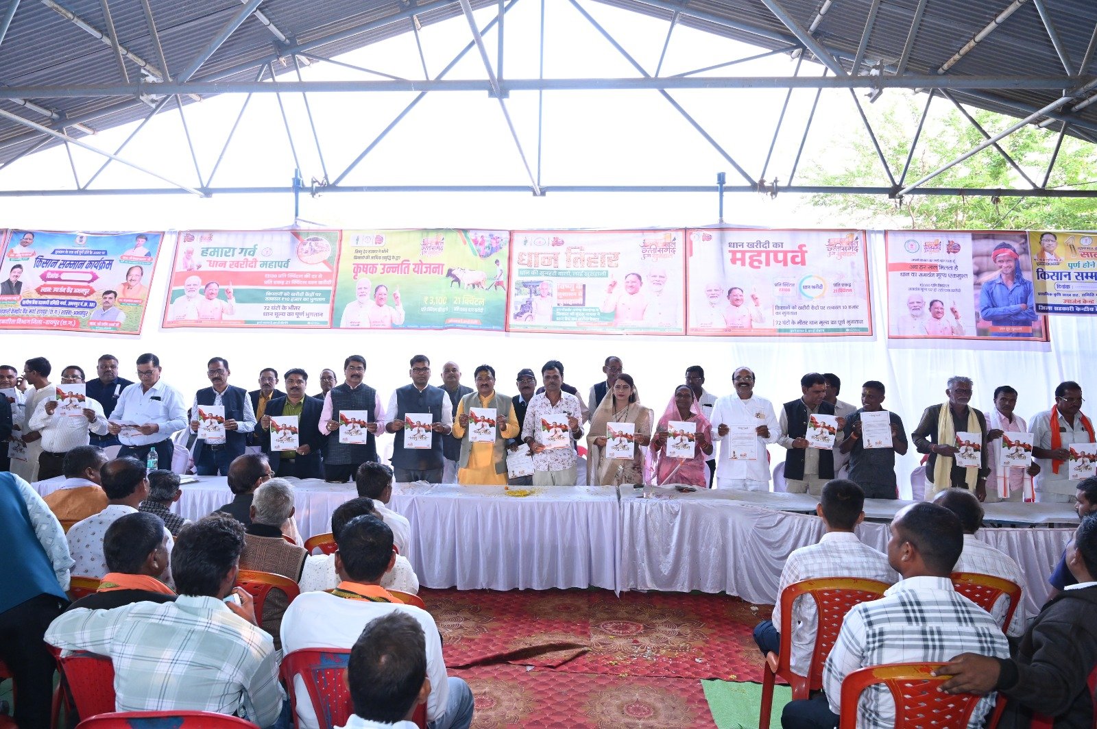 अभनपुर :- छत्तीसगढ़ सरकार के 1 वर्ष पूर्ण होने के उपलक्ष्य में कृषक संगोष्ठी सम्मेलन किया गया। सम्मेलन में विधायक श्री इन्द्र कुमार साहू के मुख्य अतिथिय एवं अध्यक्षता खेमराज कोसले के करकमलो से सम्पन्न हुआ। सम्मेलन में हजारो की संख्या में कृषकगण उपस्थित रहे। कृषको का सम्मान शॉल एवं श्रीफल से किया गया। उद्यानिकी विभाग द्वारा कार्यकम में उपस्थित कृषको को करौंदा एवं केला का पौधा वितरित किया गया। विधायक श्री साहू ने सुशासन के 01 वर्ष पूर्ण होने के उपलक्ष्य मे विष्णु की पाती का वाचन किया। श्री साहू ने कहा कि आप सभी के आर्शीवाद से सरकार ने सेवा का 1 वर्ष पूर्ण कर लिया है। आप सब की खुशहाली एवं समृद्धि हमारे सरकार की सर्वोच्च प्राथमिकता है। देश के प्रधानमंत्री नरेन्द्र मोदी के गारंटी के मुताबिक हमने 3100 रूपये प्रति क्विंटल के दर से, प्रति एकड 21 क्विंटल धान खरीदी, किसानो को खरीदी केन्द्रो पर तत्काल रूपय 10 हजार का भूगतान किये जाने तथा 72 घण्टो के भीतर धान मूल्य का पूर्ण भूगतान की बात कही गयी।