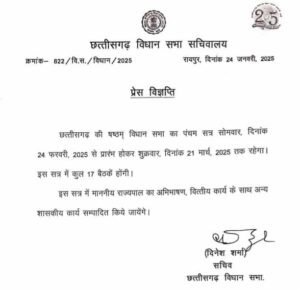 रायपुर :- छत्तीसगढ़ विधानसभा का बजट सत्र (पंचम सत्र) 24 फरवरी से शुरू होकर 21 मार्च तक चलेगा. सत्र के दौरान कुल 17 बैठकें होंगी. सत्र के दौरान वित्तीय कार्य के साथ-साथ अन्य शासकीय कार्य संपादित किए जाएंगे