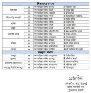 रायपुर :- छत्तीसगढ़ भाजपा ने नगरपालिका परिषदों में उपाध्यक्ष पद के चयन के लिए पर्यवेक्षकों की नियुक्ति कर दी है। भाजपा प्रदेश अध्यक्ष किरण सिंह देव ने इसकी आधिकारिक सूची जारी की, जिसमें सभी जिलों के लिए पर्यवेक्षकों के नाम शामिल हैं। भाजपा संगठन के अनुसार, पर्यवेक्षक नामित नगर पालिकाओं में जाकर उपाध्यक्ष पद के लिए चुनाव प्रक्रिया को सुचारू रूप से संचालित करेंगे।