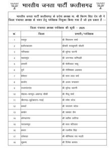 रायपुर :- भाजपा प्रदेश अध्यक्ष किरण सिंह देव ने जिला पंचायत अध्यक्ष के चयन के लिए सभी 33 जिलों में पर्यवेक्षकों की नियुक्ति की है। रायपुर में शिवरतन शर्मा, दुर्ग में गौरीशंकर अग्रवाल, धमतरी में मोतीलाल साहू, कवर्धा में नारायण चंदेल को जिम्मेदारी दी गई है।