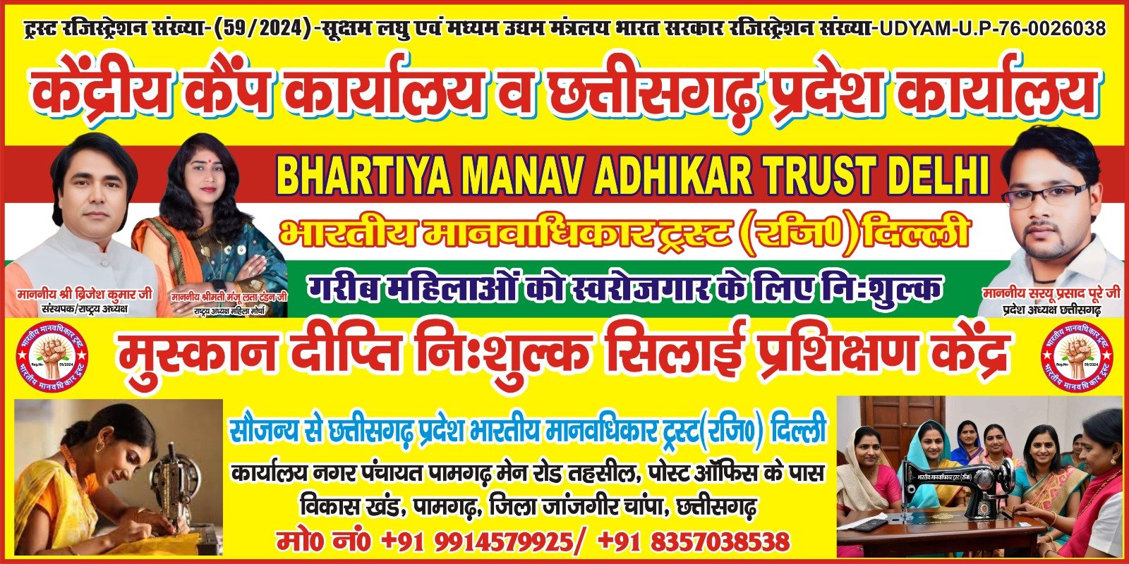 जांजगीर चांपा 21 मार्च 2025। भारतीय मानव अधिकार ट्रस्ट द्वारा गरीब महिलाओं को स्वरोजगार के लिए निशुल्क सिलाई प्रशिक्षण केंद्र बहुत जल्द खोली जाएगी महिलाओं को सशक्त व आत्मनिर्भर बनाने के लिए भारतीय मानव अधिकार ट्रस्ट के राष्ट्रीय अध्यक्ष महिला मोर्चा मंजूलता टंडन एवं छत्तीसगढ़ प्रदेश अध्यक्ष सरयू प्रसाद पूरे द्वारा लगातार क्षेत्र में महिलाओं से बातचीत कर जनसंपर्क कर रहे हैं, सराहनी कार्य से क्षेत्र में लोगों द्वारा प्रशंसा किया जा रहा है मंजुलता टंडन एक समाज सेविका है साथ ही साथ भारतीय जनता पार्टी के प्रदेश में महिला सहप्रभारी अजा मोर्चा के दायित्व का निर्वहन भी कर रही है सामाजिक क्षेत्र में 18 वर्ष से समाज में सेवा का भाव है, हमेशा सर्व समाज के सहयोग के लिए तत्पर रहती है आज फिर से गरीब महिलाओं के लिए एक अच्छा पहल की है महिलाओं को आत्मनिर्भर बनाने के लिए कार्य करते हुए भारतीय मानवाधिकार ट्रस्ट के द्वारा नि:शुल्क सिलाई प्रशिक्षण केंद्र कार्यालय नगर पंचायत पामगढ़ मेन रोड तहसील के पास पोस्ट ऑफिस के बगल में खोला जा रहा है जिसे हर वर्ग के महिलाओं को सिलाई की प्रशिक्षण निःशुल्क दी जाएगी इसके लिए भारतीय मानव अधिकार ट्रस्ट संस्था के पदाधिकारी द्वारा क्षेत्र में जनसंपर्क किया जा रहे हैं एवं प्रदेश अध्यक्ष सरयू प्रसाद पूरे एवं प्रदेश पदाधिकारी सहित छत्तीसगढ़ के कुछ विषय को लेकर सभी जिलों में एक विशेष अभियान भी चलाया जाएगा जिसके लिए संगठन तैयार किया जा रहा है, मंजूलता टंडन जी का कहना है सभी जिलों में जिला के अध्यक्ष की बैठक ली जाएगी और क्षेत्र में समस्या का निराकरण के लिए टीम तैयार की जाएगी संबंधित विभागीय अधिकारियों से संपर्क कर समस्या का निवारण किया जाएगा शिविर भी लगाई जाएगी । इस संस्था को जनप्रतिनिधि, अधिकारी कर्मचारी एवं जनता जनार्दन द्वारा सहयोग की जा रहा है । इस पहल को लेकर न सिर्फ पामगढ़ बल्कि जांजगीर चांपा जिला समेत पूरे प्रदेश में सराहना मिल रही है लोग बढ़ चढ़ कर हिस्सा ले रहे है ।