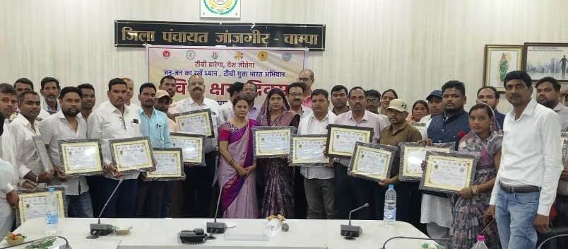 जिला क्षय उन्मूलन अधिकारी डॉ. प्रशांत सिंह बैस ने बताया कि टीबी उन्मूलन के लिए जिले में विशेष अभियान निक्षय निरामय 100 दिवसीय जांच एवं उपचार अभियान का आयोजन किया गया। अभियान में राष्ट्रीय क्षय उन्मूलन कार्यक्रम (टीबी), राष्ट्रीय कुष्ठ उन्मूलन कार्यक्रम, राष्ट्रीय वयोवृद्ध स्वास्थ्य संरक्षण कार्यक्रम को शामिल करते हुए निक्षय-निरामय शिविर (स्वास्थ्य शिविर) का आयोजन हुआ। जनसामान्य में मितानिनों द्वारा घर-घर जाकर टीबी एवं कुष्ठ के शंकाष्पद मरीजों की खोज तथा उच्च जोखिम समूहों वाले व्यक्तियों का चिन्हांकन, वयोवृद्ध व्यक्ति के हेल्थ प्रोफाईल के साथ स्वास्थ्य जांच, स्वस्थ्य जीवन शैली हेतु जागरूक किया गया। टीबी के लक्षण युक्त व्यक्तियों का उच्च गुणवत्ता से नॉट जांच तथा टीबी उच्च जोखिम वाले समूहों का निःशुल्क एक्स-रे कराते हुए नॉट जांच किया जा रहा है। इस अवसर पर उप संचालक पंचायत सह नोडल टीबी मुक्त पंचायत श्री अभिमन्यु साहू के द्वारा पंचायतों को टीबी मुक्त करने हेतु विस्तृत कार्य योजना की जानकारी दी गई। इसके साथ ही वर्ष 2023 में कुल 58 ग्राम पंचायतों को 01 वर्ष की वैधता के लिए टीबी मुक्त पंचायत का प्रमाण पत्र सरपंचो को प्रदाय किया गया। जिसमें विकासखंड अकलतरा से ग्राम पंचायत अर्जुनी, पिपरसत्ती, फरहदा, पड़रिया एवं बिरकोनी, विकासखंड बलौदा से बछौद, भिलाई, झपेली, कण्डरा, खोहा, कुलीपोटा, महुदा ब. नवगंवा, पोंच, विकासखंड पामगढ़ से झूलन, देवरी, भुईगांव, झिलमली, महका, मेकरी, खोखरी, पचरी, पनगांव, हिर्री एवं सिर्री, विकासखंड नवागढ़ से बरबसपुर, बेल्हा, कुरियारी, पचरी, कनस्दा, हिरागढ़, नवापारा, चौराभाठा, कर्रा, गंगाजल, खैरताल, पाली, हाथीटिकरा, मरकाडीह, करमंदी, तेदुभाठा, एवं घुठिया तथा विकासखंड बम्हनीडीह से बनसुला, बसंतपुर, देवरहा, देवरी, गिधोरी, झरना, खमहिया, कुम्हारीकला, लछनपुर, महुवाडीह, मोहगांव, परसापाली (री), परसापाली, रिस्दा, सोनियापाठ एवं बघौदा ग्राम पंचायतों को टीबी मुक्त पंचायत का प्रमाण पत्र वितरित किया गया।