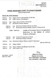 रायपुर :- प्रधानमंत्री नरेंद्र मोदी आज यानी 30 मार्च को छत्तीसगढ़ दौरे पर रहेंगे। इस दौरान वे छत्तीसगढ़ को कई बड़ी सौगात देंगे पीएम मोदी सीजीडी, वीआरपीएल परियोजना और 7 रेलवे परियोजनाओं की आधारशिला रखेंगे। पीएम दोपहर 2.30 बजे वो एयरपोर्ट पहुंचेंगे जहां हेलीकाप्टर से वो बिलासपुर जाएंगे और आमसभा को संबोधित करेंगे। इसके बाद शाम 5.30 बजे वो वापस दिल्ली के रवाना हो जाएंगे।