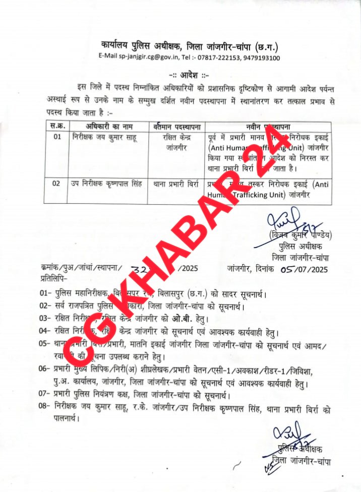 वहीं उप निरीक्षक कृष्णपाल सिंह, जो वर्तमान में थाना प्रभारी बिर्रा के रूप में कार्यरत थे, को अब मानव तस्कर निरोधक इकाई (Anti Human Trafficking Unit) जांजगीर का प्रभारी नियुक्त किया गया है।