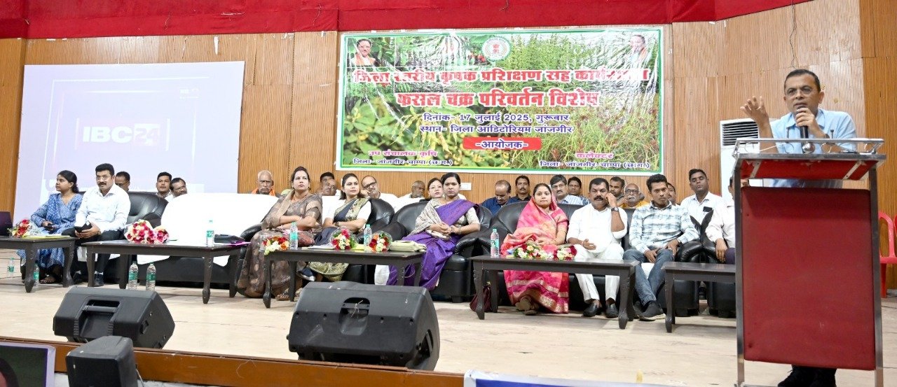 जांजगीर-चांपा, 17 जुलाई 2025/ कलेक्टर श्री जन्मेजय महोबे के निर्देशन में जिला स्तरीय कृषक प्रशिक्षण सह कार्यशाला का आयोजन आज ऑडिटोरियम जांजगीर में किया गया। कार्यशाला का उद्देश्य किसानों की आय बढ़ाना, कृषि नवाचार, नवीनतम कृषि तकनीकों, योजनाओं एवं सरकार द्वारा संचालित विभिन्न लाभकारी कार्यक्रमों की जानकारी देना था। कार्यशाला में फसल चक्र, ऑयल पाम खेती, दलहन-तिलहन, बागवानी, मशरूम उत्पादन, मछली पालन, कुकुट पालन, पशुपालन, धान के बदले अन्य लाभकारी फसल, कीट प्रबंधन सहित अन्य महत्वपूर्ण कृषि विषयों पर किसानों को जानकारी दी गई। कार्यशाला में किसानों को आधुनिक कृषि तकनीकों और स्थायी खेती के तरीकों से अवगत कराया गया, ताकि वे अपनी आय बढ़ा सकें और मिट्टी के स्वास्थ्य को भी बनाए रख सकें। कार्यशाला में कलेक्टर श्री जन्मेजय महोबे सहित विभिन्न जनप्रतिनिधि, अधिकारी-कर्मचारी एवं बड़ी संख्या में कृषक शामिल हुए।