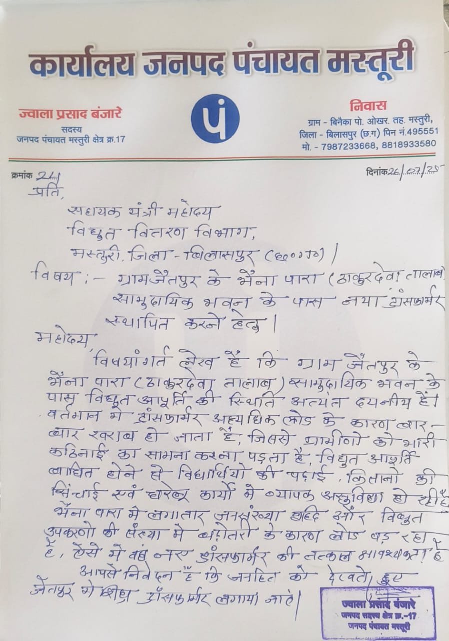 मस्तूरी, 27 जुलाई 2025। जनपद क्षेत्र क्रमांक 17 के ग्राम जैतपुर अंतर्गत भैनापारा मोहल्ले में लगातार बनी बिजली की गंभीर समस्या को लेकर जनपद सदस्य श्री ज्वाला प्रसाद बंजारे ने विद्युत विभाग को पत्र लिखकर नया ट्रांसफार्मर स्थापित करने की मांग की है। यह ट्रांसफारMER सामुदायिक भवन के पास प्रस्तावित है, जिससे क्षेत्र के दर्जनों परिवारों को बड़ी राहत मिलने की उम्मीद है।