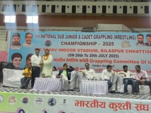 महेंद्र सिंह राय | बिलासपुर छत्तीसगढ़ की सांस्कृतिक नगरी बिलासपुर के बहतराई स्टेडियम में पांचवीं सब-जूनियर राष्ट्रीय ग्रैपलिंग रेसलिंग प्रतियोगिता 2025 का आयोजन बड़े ही भव्य और गरिमामयी माहौल में जारी है। प्रतियोगिता में देशभर के 17 राज्यों से आए प्रतिभागी अपने कुशल दांव-पेंच और अनुशासित खेल भावना से दर्शकों का मन मोह रहे हैं।