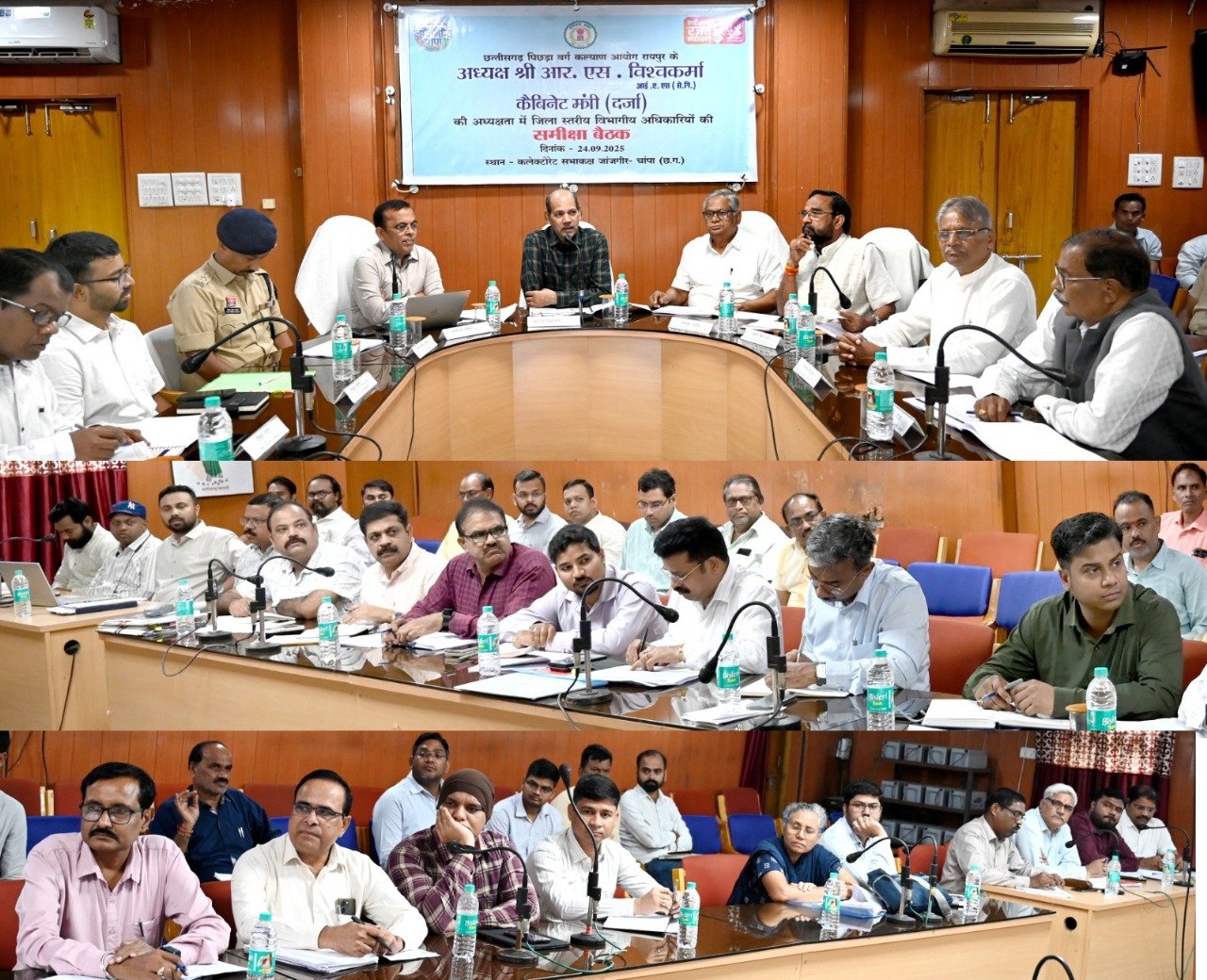 जांजगीर-चांपा 24 सितम्बर 2025/ छत्तीसगढ़ राज्य पिछड़ा वर्ग कल्याण आयोग के अध्यक्ष, केबिनेट मंत्री दर्जा प्राप्त आईएएस (सेवानिवृत्त) श्री आर.एस. विश्वकर्मा ने आज कलेक्टोरेट सभाकक्ष में जिला स्तरीय विभागीय अधिकारियों की समीक्षा बैठक ली। इस दौरान आयोग के सदस्य श्री नीलांबर नायक, श्री बलदाऊ राम साहू, श्री हरिशंकर यादव, श्री यशवंत सिंह वर्मा, कलेक्टर श्री जन्मेजय महोबे, पुलिस अधीक्षक श्री विजय कुमार पांडेय, वनमंडलाधिकारी श्री हिमांशु डोंगरे, जिला पंचायत सीईओ श्री गोकुल कुमार रावटे, अपर कलेक्टर श्री ज्ञानेन्द्र सिंह ठाकुर, अपर कलेक्टर श्री आर के तंबोली, संयुक्त कलेक्टर श्री संदीप सिंह ठाकुर सहित विभागीय अधिकारी कर्मचारी उपस्थित थे।