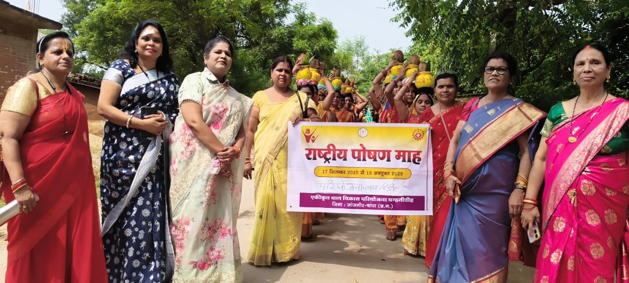 जांजगीर-चांपा 29 सितम्बर 2025/ कलेक्टर श्री जन्मेजय महोबे के निर्देशन में राष्ट्रीय पोषण माह अंतर्गत कार्यालय परियोजना अधिकारी एकीकृत बाल विकास परियोजना बम्हनीडीह में सुपोषण रथ के साथ सुपोषण कलश यात्रा सहित विविध कार्यक्रम का आयोजन किया गया। उक्त कार्यक्रम में जिला कार्यक्रम अधिकारी श्रीमती अनिता अग्रवाल, सखी वन स्टॉप केन्द्र प्रशासक सुश्री निशा खान, परियोजना अधिकारी जांजगीर श्रीमती अणिमा मिश्रा, चाइल्ड लाईन से श्रीमती संतोषी वैष्णव, परियोजना अधिकारी बम्हनीडीह श्रीमती ऋचा तिवारी सहित संबंधित अधिकारी-कर्मचारी व बड़ी संख्या में नागरिक जन उपस्थित थे।