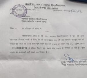 उसके बाद भी रेत माफिया रेत निकालने मे लगे थे वही आज शिवरीनारायण तहसीलदार को शिकायत मिली की महानदी मे रेत निकालने ट्रेक्टर गई हुई है. जिसपर तहसीलदार बजरंग साहू ने टीम भेज कर छापा मार कार्यवाही किया लेकिन नगर पंचायत सीएमओ के लिखित आदेश को पाकर नायब तहसीलदार कुणाल पांडे ने तीन ट्रेक्टर को छोड़ दिया. और बाकी ट्रेक्टरों को शिवरीनारायण थाने के सुपुर्द में रखा गया है अब यहां सीएमओ संध्या वर्मा पर ये सवालिया निशान खड़ा होता है कि आखिर मैडम जी ने उच्च अधिकारियों की आदेश को अनदेखा कर अपने मनमाने तरीके से तहसीलदार को लिखित पत्र क्यों दिया ये जांच का विषय है