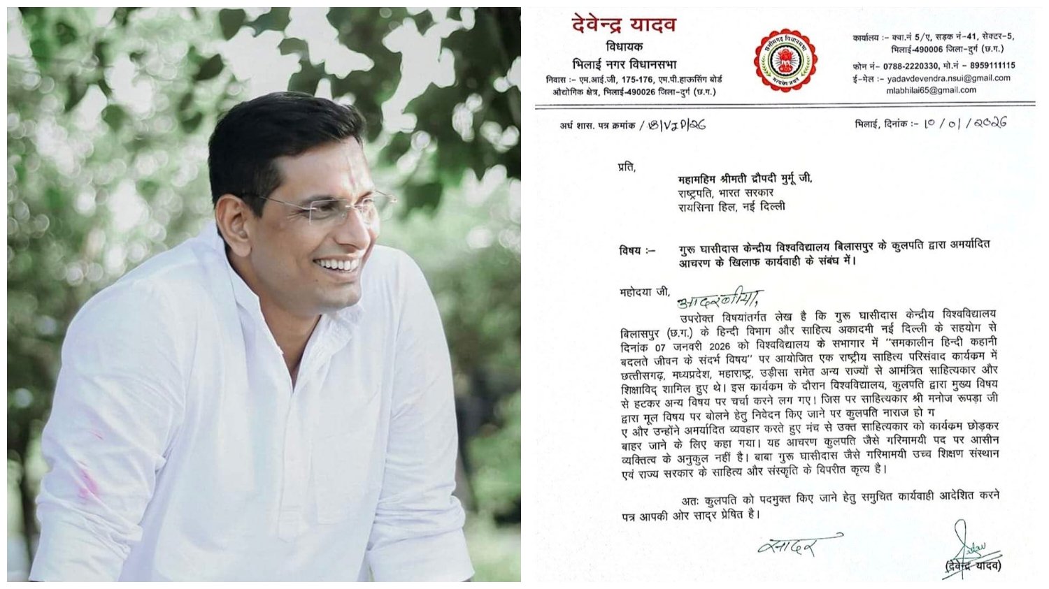 बिलासपुर | 10 जनवरी 2026 गुरु घासीदास केंद्रीय विश्वविद्यालय, बिलासपुर के कुलपति द्वारा किए गए अमर्यादित एवं असंवैधानिक आचरण को लेकर गंभीर चिंता व्यक्त की गई है। इस संबंध में भिलाई नगर विधायक देवेंद्र यादव ने भारत की महामहिम राष्ट्रपति श्रीमती द्रौपदी मुर्मू को पत्र लिखकर कुलपति के विरुद्ध उचित कार्रवाई एवं पदमुक्त किए जाने की माँग की है।