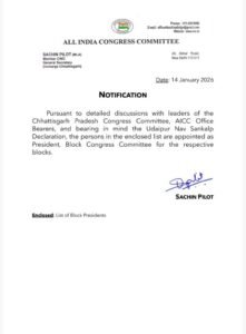 रायपुर, 14 जनवरी 26। लंबे इंतजार के बाद छत्तीसगढ़ कांग्रेस संगठन को नई दिशा देते हुए अखिल भारतीय कांग्रेस कमेटी (AICC) ने प्रदेशभर में 307 ब्लॉक कांग्रेस अध्यक्षों की नियुक्ति कर दी है। वरिष्ठ नेताओं से विस्तृत चर्चा और संगठनात्मक समीक्षा के बाद यह आदेश जारी किया गया है।