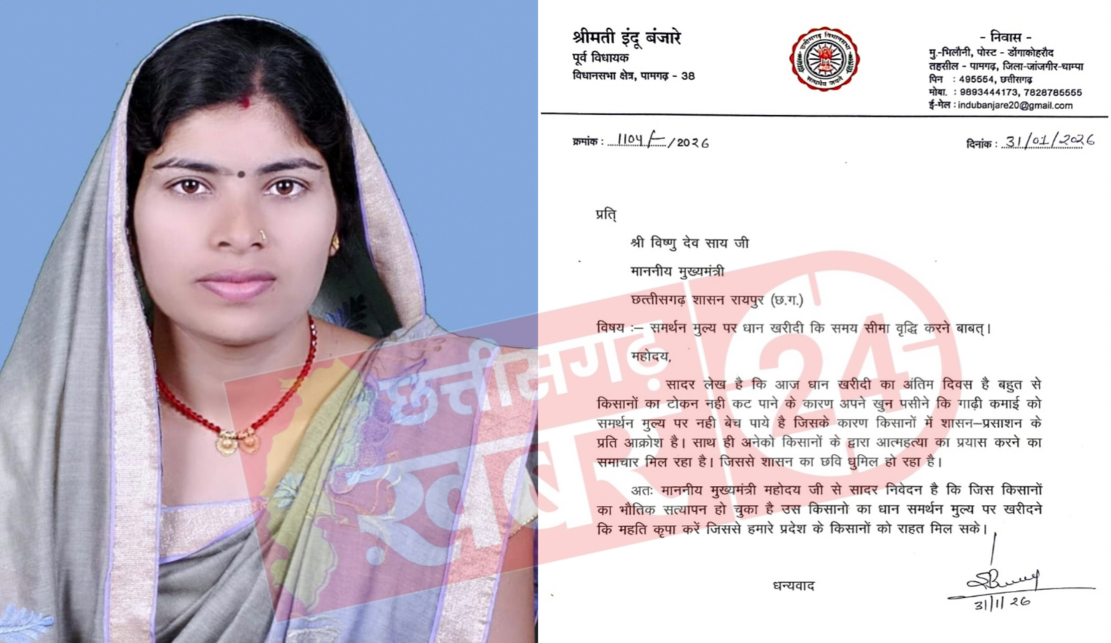 धान खरीदी की समय-सीमा बढ़ाने की मांग तेज, पूर्व विधायक इंदु बंजारे ने मुख्यमंत्री को लिखा पत्र
