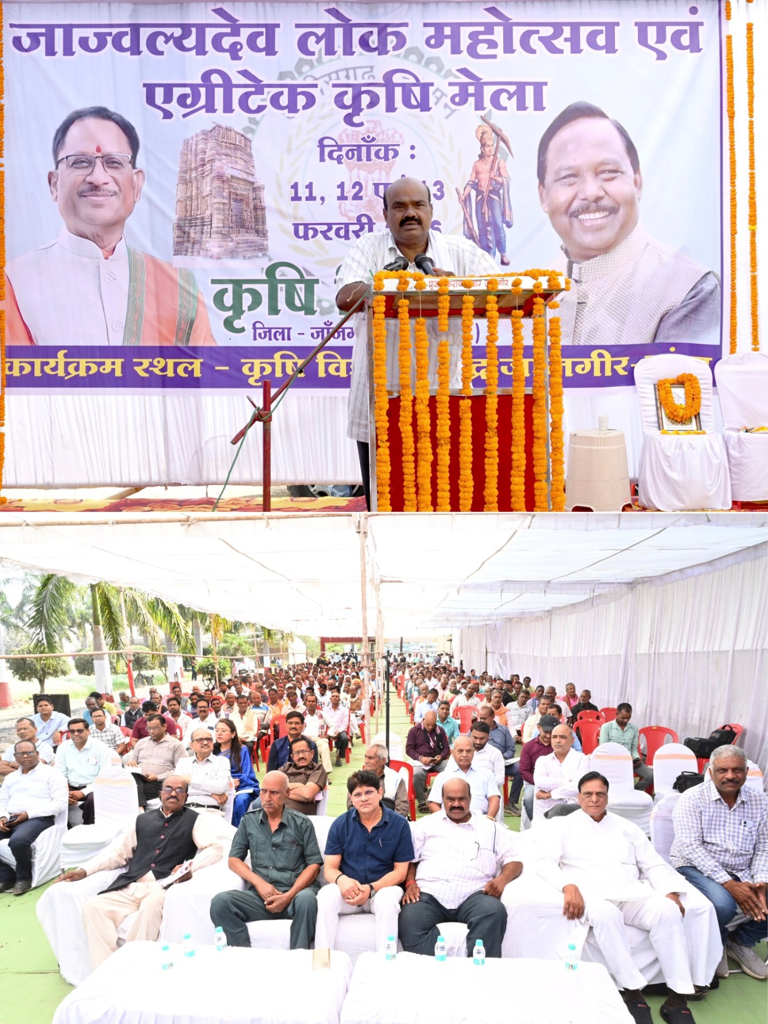 जांजगीर, 11 फरवरी 2026। जाज्वलय देव लोक महोत्सव एवं एग्रीटेक कृषि मेला में कृषि विज्ञान केंद्र, जांजगीर में आज प्रातः 10 बजे किसान सम्मेलन कार्यक्रम का शुभारंभ किया गया। जिले भर से आए किसानों ने कार्यक्रम में अपनी हिस्सेदारी निभाई। कार्यक्रम के दौरान कृषि विशेषज्ञों ने ग्रीष्मकालीन उन्नत किस्मों की कार्यशाला, ग्रीष्मकालीन उद्यानिकी फसल, बीज उत्पादन, आधुनिक खेती तकनीक, उन्नत बीज, जैविक खेती, फसल संरक्षण एवं नवीन कृषि उपकरणों की जानकारी प्रदान की। किसानों को कम लागत में अधिक उत्पादन प्राप्त करने के उपाय भी बताए गए। इस दौरान जांजगीर-चांपा विधायक श्री ब्यास कश्यप ने कृषि विज्ञान केंद्र, जांजगीर में आयोजित कार्यक्रम को संबोधित करते हुए कहा कि बदलते समय में किसानों को आधुनिक एवं वैज्ञानिक तकनीकों को अपनाना आवश्यक है। उन्होंने कहा कि उन्नत बीज, जैविक खेती, फसल विविधीकरण और नवीन कृषि उपकरणों के उपयोग से उत्पादन बढ़ाया जा सकता है तथा किसानों की आय में उल्लेखनीय वृद्धि संभव है। उन्होंने कहा कि कृषि क्षेत्र में नवाचार और जागरूकता ही आत्मनिर्भर एवं समृद्ध किसान की दिशा में सबसे बड़ा कदम है। इस अवसर पर श्री राजकुमार साहू जिला पंचायत सभापति, श्री गुलाब सिंह चंदेल ने भी संबोधित किया। इस अवसर पर श्री बिशुन कश्यप, श्री शिव तिवारी, श्री दुष्यंत सिंह एवं श्री संदीप तिवारी उपस्थित रहे।