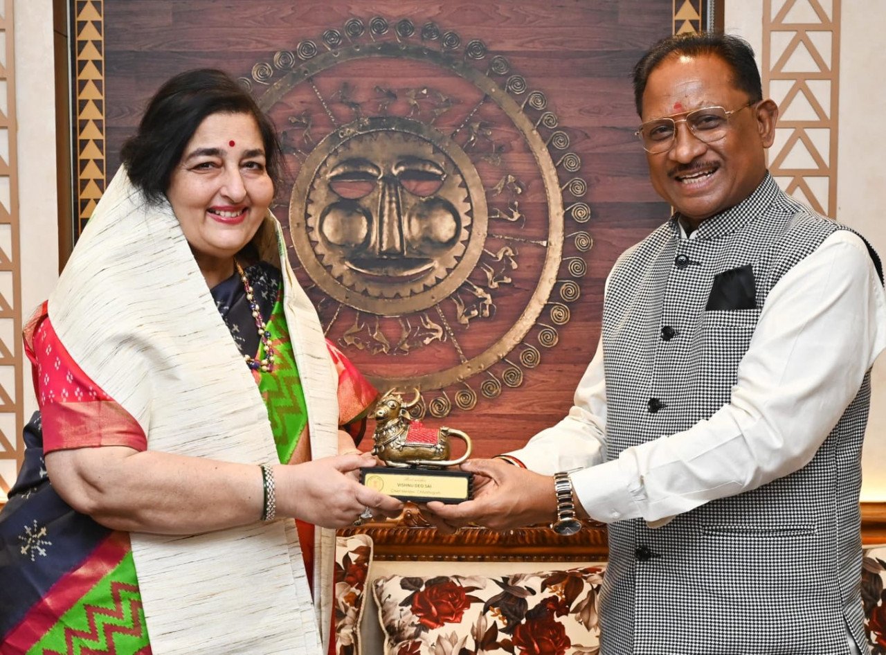 रायपुर :- मुख्यमंत्री श्री विष्णु देव साय से आज छत्तीसगढ़ विधानसभा स्थित उनके कक्ष में पद्मश्री अनुराधा पौडवाल ने सौजन्य भेंट की। मुख्यमंत्री श्री साय ने छत्तीसगढ़ आगमन पर शॉल और बेल मेटल की नन्दी भेंट कर उनका स्वागत और अभिनंदन किया। मुख्यमंत्री श्री साय और पद्मश्री अनुराधा पौडवाल के मध्य छत्तीसगढ़ की लोककला, गीत-संगीत और संस्कृति को लेकर विस्तृत चर्चा हुई। इस अवसर पर विधायक और पद्म श्री अनुज शर्मा उपस्थित थे।