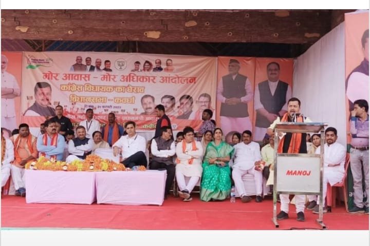 कवर्धा। मोर आवास मोर अधिकार योजना के तहत भाजपा छत्तीसगढ़ में विधानसभा वार आंदोलन कर रही है. इसी प्रकार कवर्धा विधानसभा में विधायक कार्यालय का घेराव और सभा का आयोजन गांधी मैदान में किया गया, जिसमे प्रदेश भाजपा सह प्रभारी नितिन नबीन एक दिवसीय प्रवास पर कवर्धा पहुंचे जिसमे भाजपा कार्यकर्ताओं के द्वारा ठाकुर देव चौक में आदिवासी बैगा नृत्य और गाजे बाजे के साथ भव्य स्वागत किया गया। इसी कड़ी में जिला अध्यक्ष अनिल सिंह और विजय शर्मा प्रदेश महामंत्री ने आंदोलन की अगुवाई की. बड़ी संख्या में कार्यकर्ताओं के साथ वंचित हितग्रहियों ने रैली की शक्ल में कांग्रेस विधायक मोहम्मद अकबर कार्यालय घेराव किया.